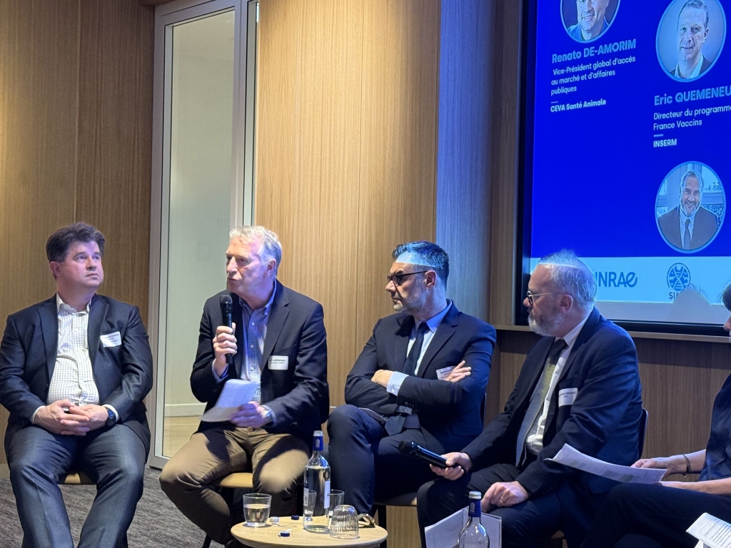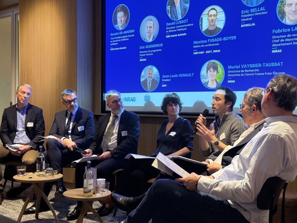 La table ronde a réuni des acteurs clés de la recherche publique et l’industrie de la santé animale : Renato Amorim (Vice-président Global Market Access & Public Affairs, Ceva Santé Animale), David Lussot (Directeur Communications et Affaires Publiques, MSD Santé Animale), Éric Quemeneur (Directeur du programme France Vaccins, INSERM), Fabrice Laurent (Directeur de recherche, chef de département adjoint Santé animale, INRAE), Éric Sellal (PDG, Biosellal) et Maxime Fusade-Boyer (Directeur de recherche UMR IHAP, INRAE-ENVT). Les échanges étaient animés par Jean-Louis Hunault (Président du SIMV) et Muriel Vayssier-Taussat (Directrice du Carnot France Futur Élevage, INRAE).
